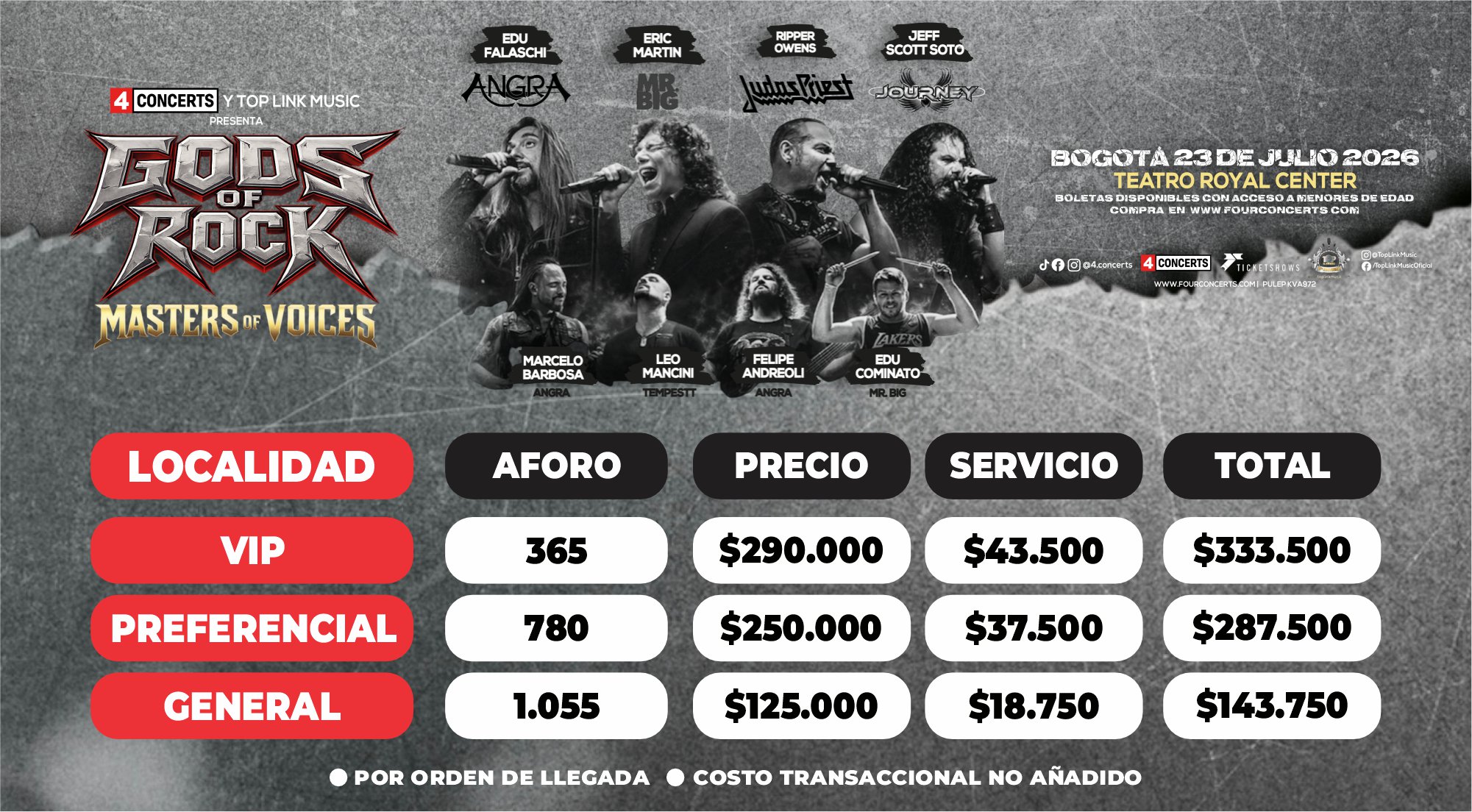 El 23 de julio de 2026 en el Teatro Royal Center de Bogotá, el público vivirá una experiencia irrepetible cargada de potencia, virtuosismo y nostalgia, donde los dioses del rock se reunirán para celebrar la grandeza de sus canciones más legendarias. Un evento imperdible para quienes sienten el rock como parte de su historia. 🎸🔥.