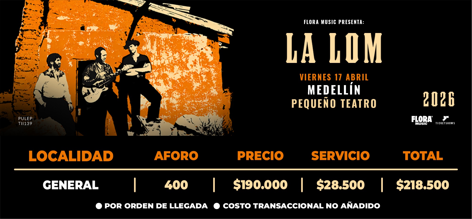 Prepárate para una noche inolvidable con LA LOM, el trío instrumental de Los Ángeles que redefine la memoria musical. Nacidos de la vibrante escena multicultural de la ciudad, Zac Sokolow (guitarra), Jake Faulkner (bajo) y Nicholas Baker (batería y percusión) mezclan cumbia sonidera, boleros románticos, soul de los años 50 y rockabilly con toques psicodélicos en un sonido que cautiva desde la primera nota. Con arreglos que evocan recuerdos profundos y ritmos que invitan al movimiento, sus presentaciones son mucho más que un concierto: son un viaje emocional donde cada pieza revive melodías conocidas y las reinventa con una identidad propia. Su música ha conquistado audiencias en distintos países y los ha llevado a presentarse en salas y festivales de gran relevancia. No te pierdas su próxima presentación. Descubre en vivo la fusión entre tradición y modernidad que define a LA LOM y asegura tu entrada para una experiencia sonora única.