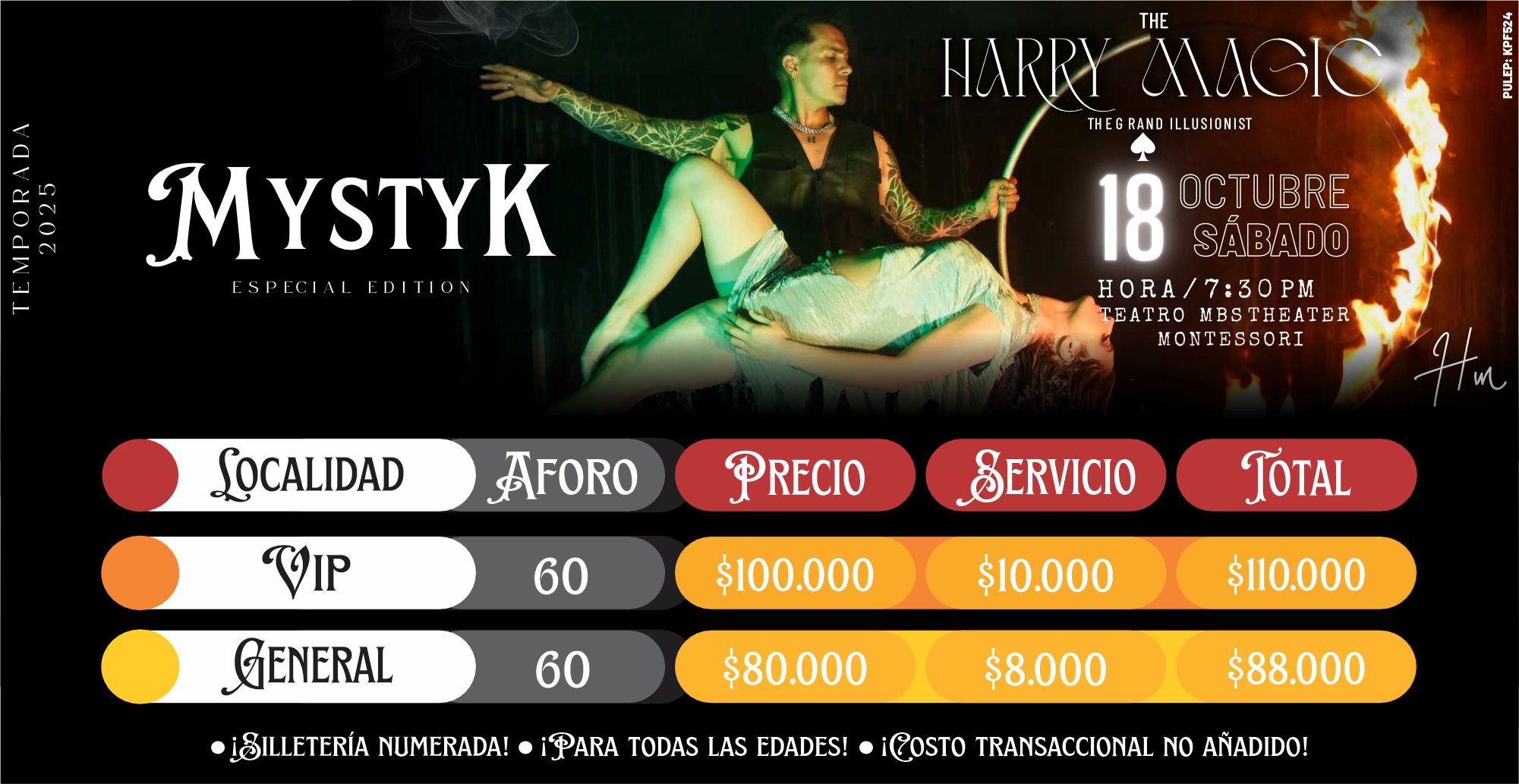 MYSTYK es una experiencia mágica que desafía los límites de la imaginación. Un espectáculo que combina lo imposible con lo inolvidable, donde la magia, el escapismo, el mentalismo, los efectos especiales, el teatro, la danza y las artes circenses se entrelazan en una puesta en escena impactante. Cada acto invita a sumergirse en un viaje sensorial que flota entre la realidad y el sueño, envolviendo al público en un ambiente lleno de asombro y emoción.