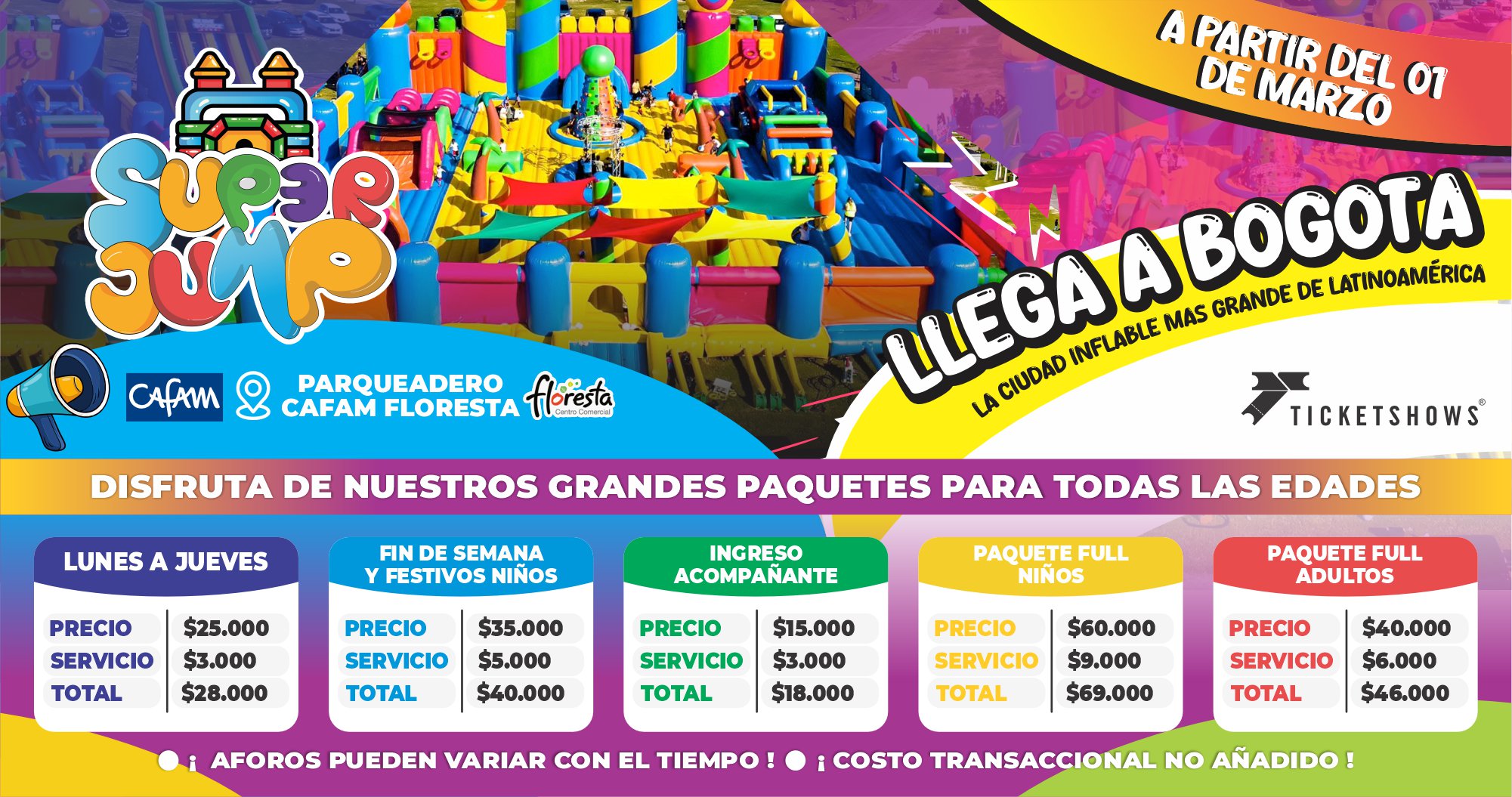 ¡Prepárate para vivir una experiencia llena de diversión, adrenalina y color! Super Jump, la ciudad inflable más grande de Latinoamérica, llega a Bogotá del 1 de marzo al 30 de abril de 2026 en el Parqueadero Cafam Floresta. Un increíble parque inflable con zonas diseñadas para disfrutar, reír y saltar sin parar, ideal para compartir en familia o con amigos.